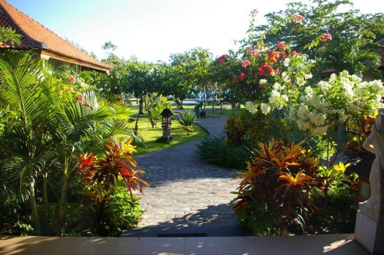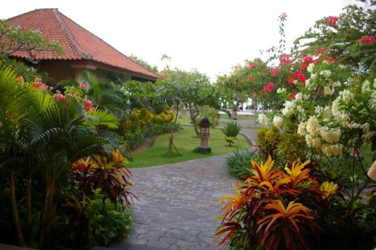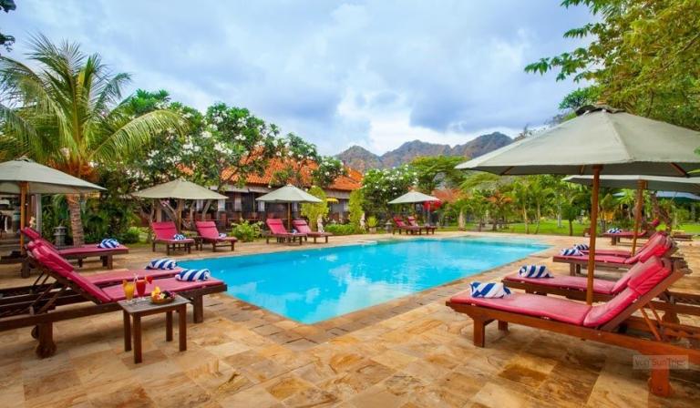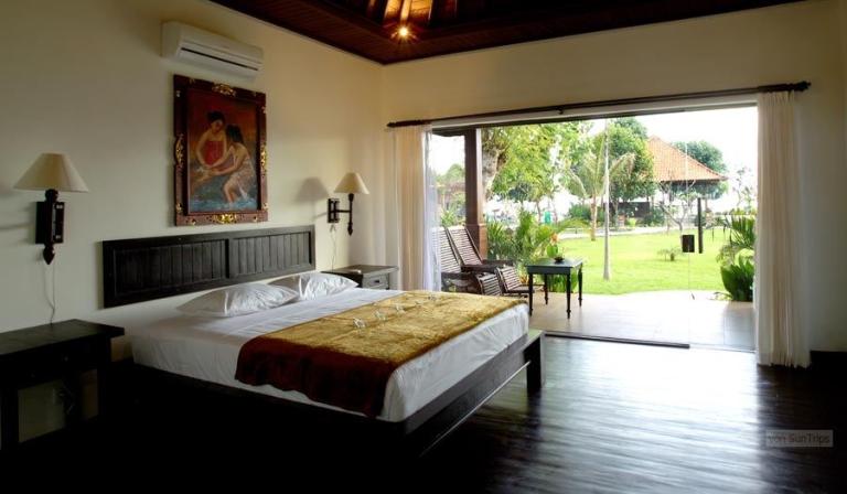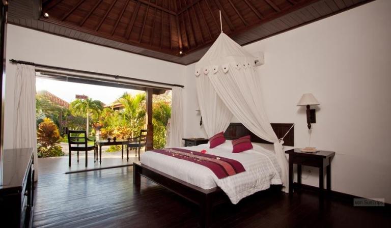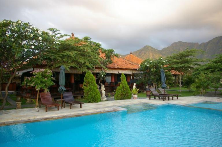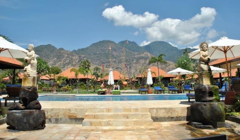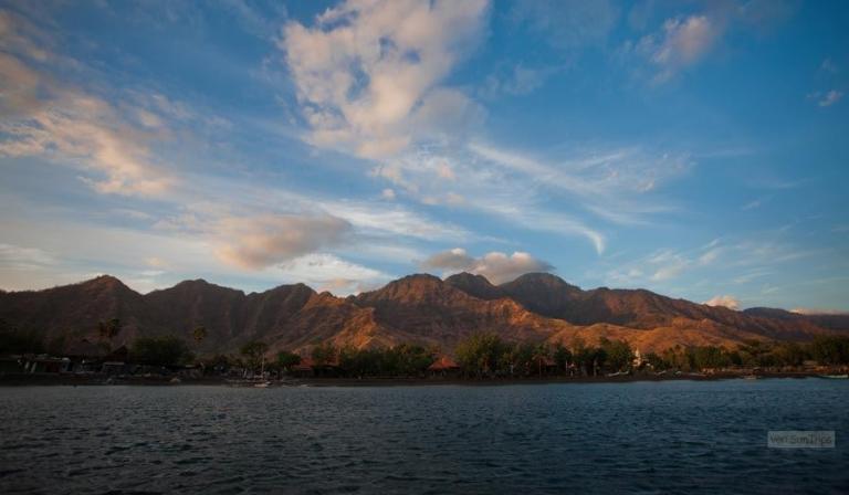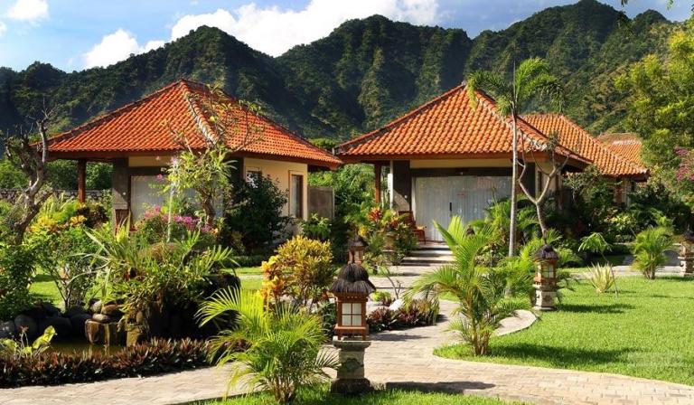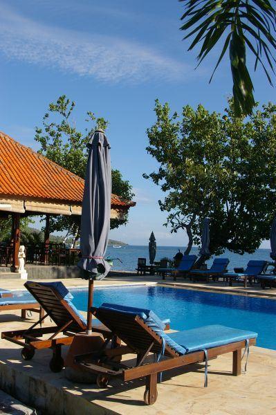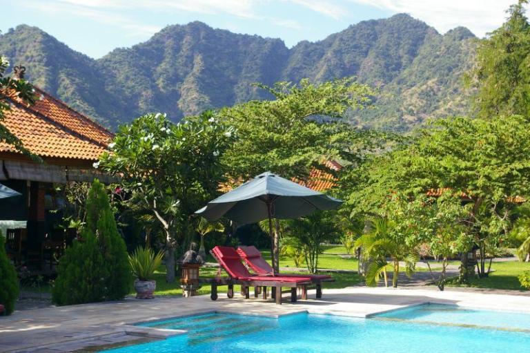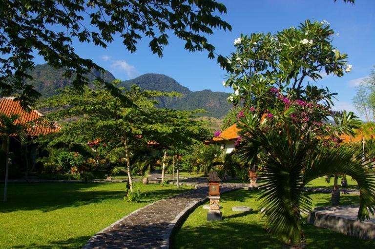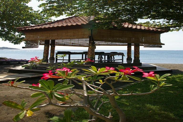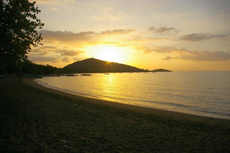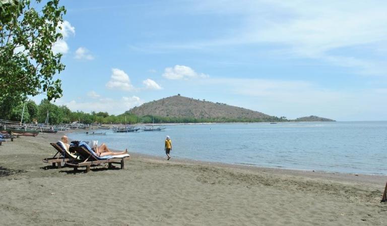 Direkt am feinsandigen, dunklen Lavastrand im Nordwesten Balis bei Pemutran. Die idyllische Umgebung zeichnet sich durch das großartige Panorama der Bergketten des West Bali Nationalparks aus.
