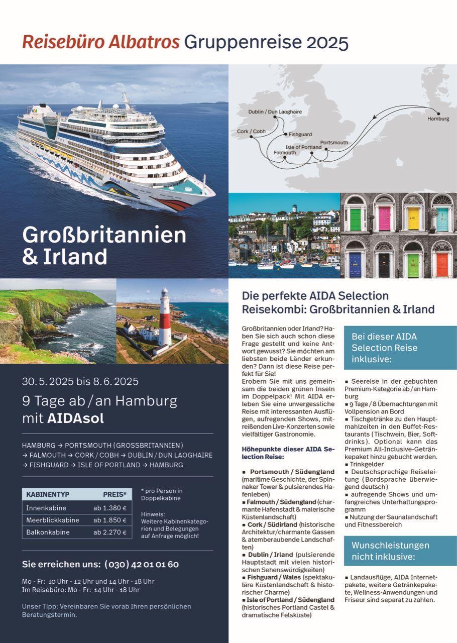 Deshalb haben wir vom 30.Mai 2025 bis zum 8.Juni 2025 eine erlebnisreiche Gruppenreise nach Großbritannien & Irland mit der AIDAsol aufgelegt.